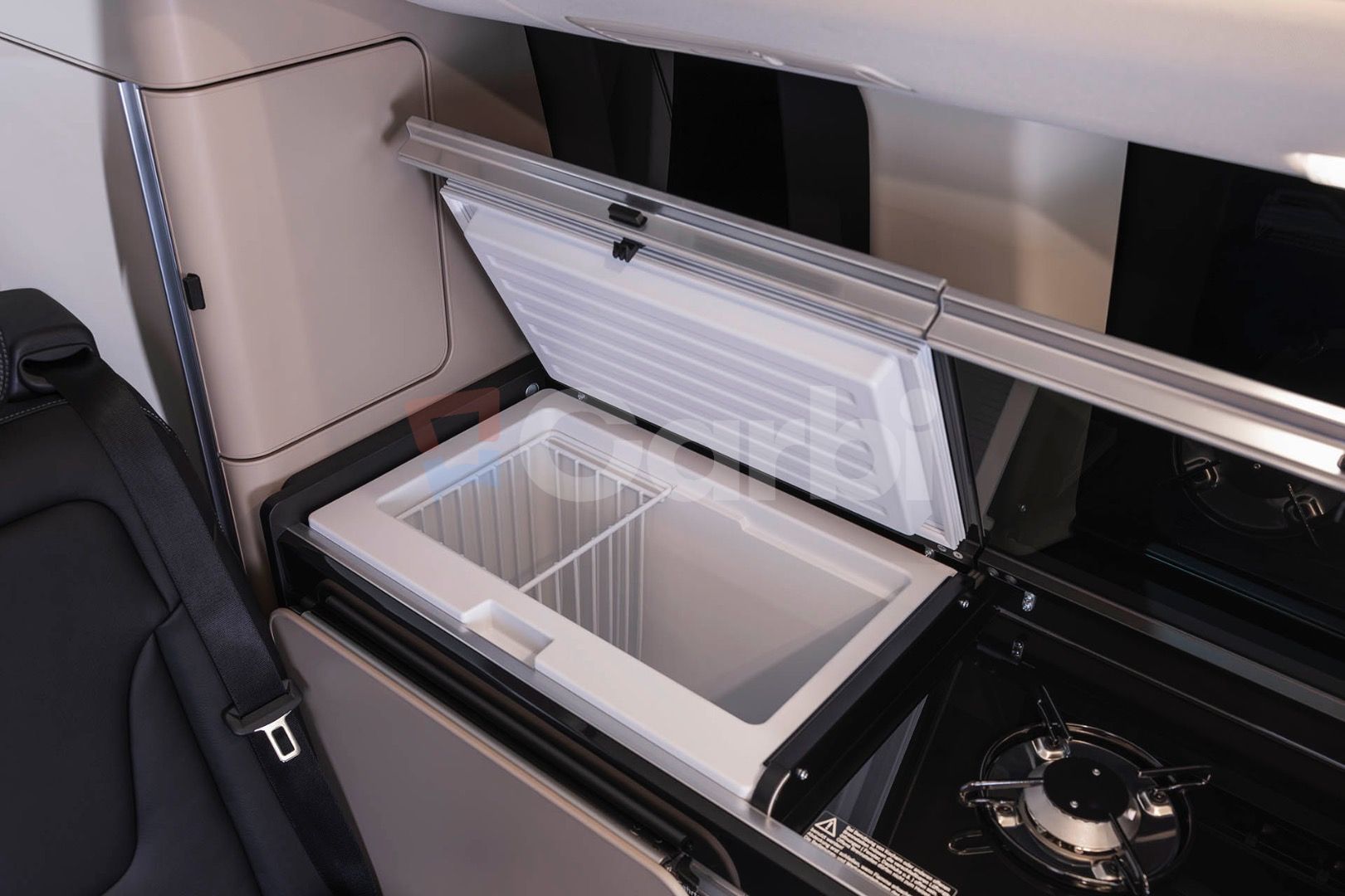 Interiér Marco Polo zostáva jedným z najlepšie integrovaných obytných riešení v segmente. Kuchynská linka je pevnou súčasťou karosérie, nie dodatočnou nadstavbou. Obsahuje plynový varič, drez s vodnou nádržou, kompresorovú chladničku a rozumné množstvo odkladacích priestorov. Všetko je riešené tak, aby počas jazdy nič nehrkotalo a aby sa dalo auto používať aj bez pocitu, že so sebou veziete kuchyňu na kolieskach.