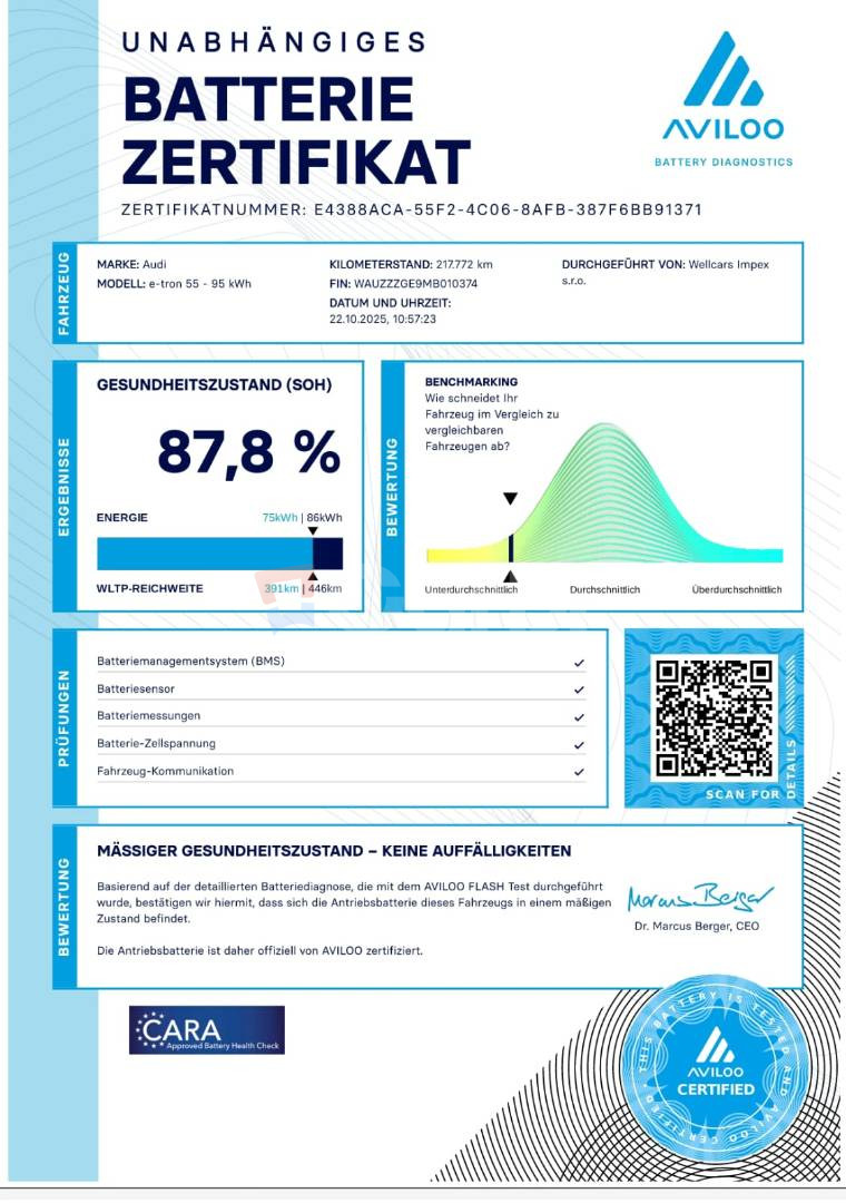 Audi E-tron 55 quattro - väčšia 95 kWh batéria - reálny dojazd na úrovni 400 až 500 km podľa štýlu jazdy Spravený test batérie cez Aviloo s výsledkom 87% - certifikát medzi fotkami